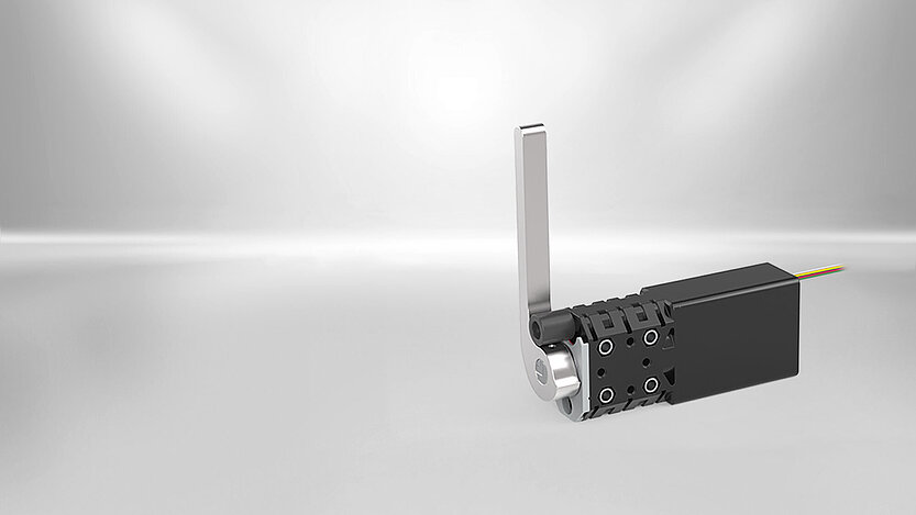 The BSM043 consists of a rotary solenoid that an aluminum finger has extended. With its bistable design and an angle of rotation of 90°, the assembly is used for secure mounting and dismounting in modern shuttle storage systems.