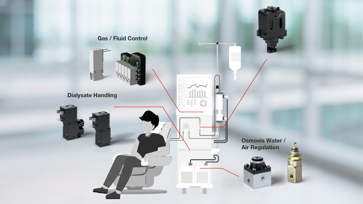 Another important component for controlling liquids and gases in dialysis machines are solenoid valves and the FluidBoard® valve assembly from Kendrion. The FluidBoard® consists of several valves and at least two plastic plates that are joined together using laser welding technology. The solenoid valves ensure precise and reliable control of the fluid and gas flow during dialysis treatment, for example, in therapeutic plasmapheresis.