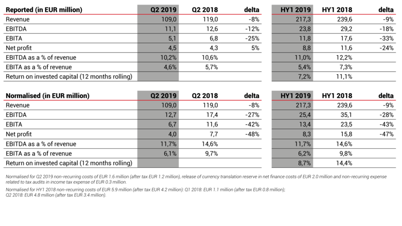 - Normalised EBITDA in HY1 2019 of EUR 25.4 million from EUR 35.1 million in HY1 2018