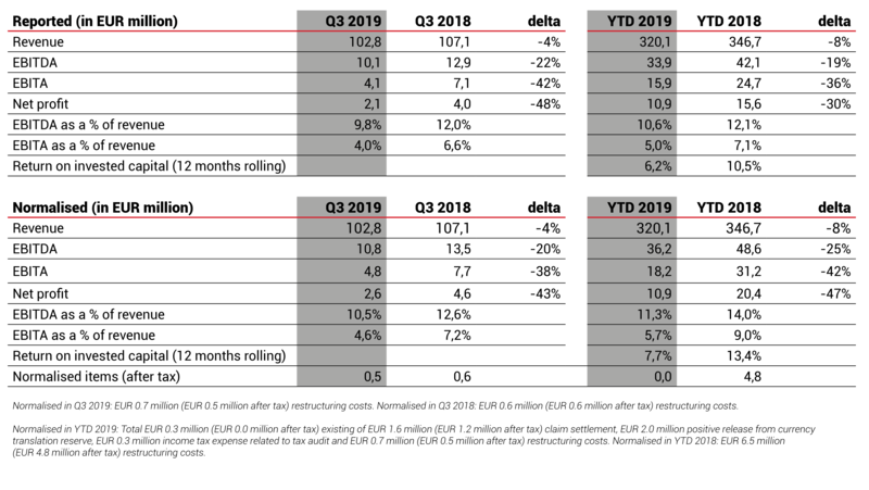 - Net profit (normalised) of EUR 2.6 million in Q3 2019 (Q3 2018: EUR 4.6 million)