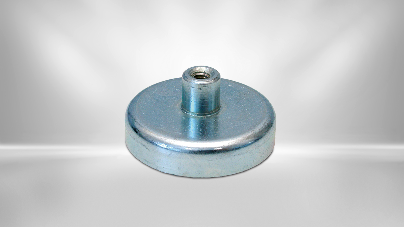 Flat gripper with a hard ferrite magnet in a steel pot. The housing increases the adhesive force of the permanent magnet. The maximum adhesive force is achieved when the entire surface is placed on a metallic surface. The flat gripper has a threaded socket with an internal thread.