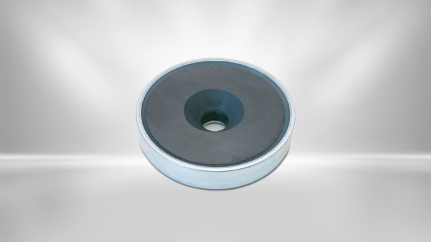 Flat gripper with a hard ferrite magnet in a steel pot. The housing increases the adhesive force of the permanent magnet. The maximum adhesive force is achieved when the entire surface is placed on a metallic surface. The flat gripper has a bore and countersink and can be screwed on with a countersunk screw.