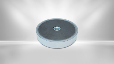 Flat gripper with a hard ferrite magnet in a steel pot. The housing increases the adhesive force of the permanent magnet. The maximum adhesive force is achieved when the entire surface is placed on a metallic surface. The flat gripper has a central internal thread.
