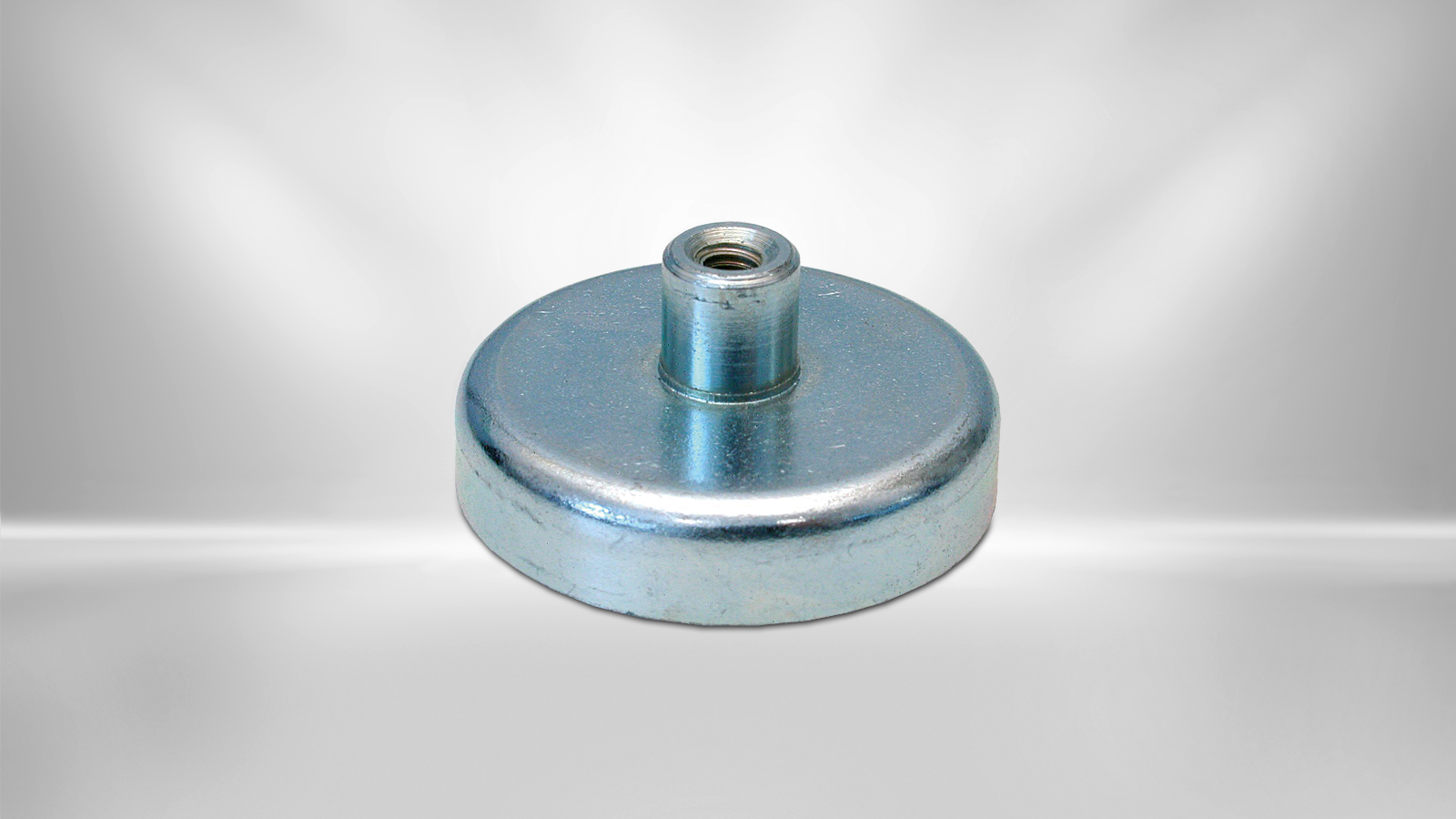 Flat gripper with a samarium-cobalt magnet in a steel pot. The housing increases the adhesive force of the permanent magnet. The maximum adhesive force is achieved when the entire surface is placed on a metallic surface. The flat gripper has a threaded socket with an internal thread.