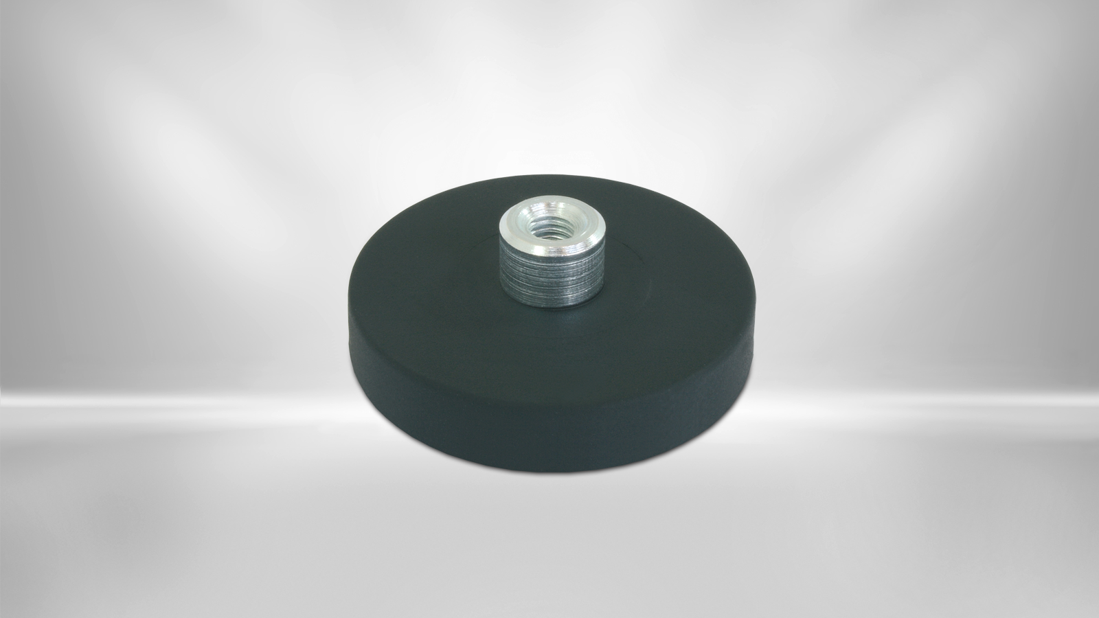 Flat gripper with a neodymium magnet in a rubber-coated steel pot. The housing increases the adhesive force of the permanent magnet. The maximum adhesive force is achieved when the entire surface is placed on a metallic surface. The flat gripper has a threaded socket with an internal thread.