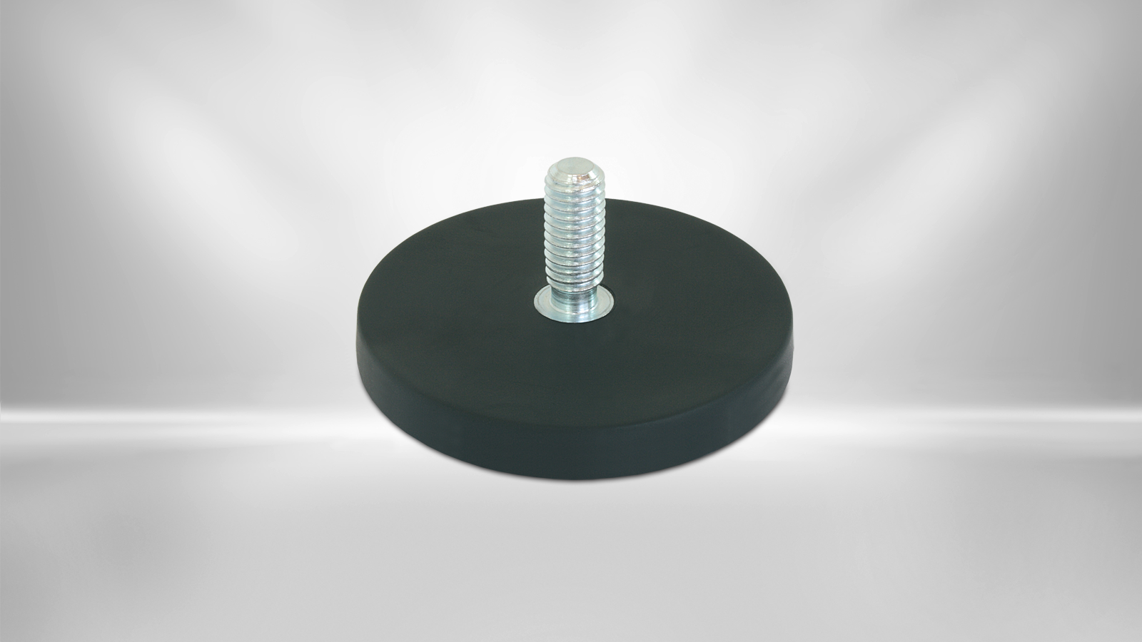 Flat gripper with a neodymium magnet in a rubber-coated steel pot. The housing increases the adhesive force of the permanent magnet. The maximum adhesive force is achieved when the entire surface is placed on a metallic surface. The flat gripper has a threaded pin with an external thread.
