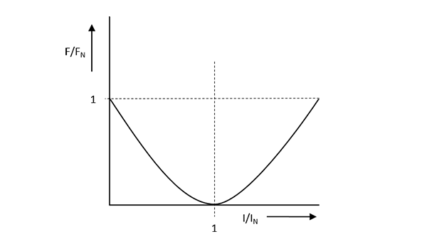 Figure right displays the size of the holding force FH of a permanent electro-holding magnet depending on the nominal current IN at which the force equals 0 exactly. Depending on the operating conditions, the operating current differs slightly from the nominal current so that a residual holding force FR remains. Ensure that if the current is increased above the nominal current, the holding force will also be too great.